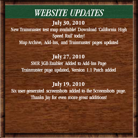 Welcome to Kurt's Railroad Tycoon Fan Station. This site is for fans of the Railroad Tycoon PC Game Series, which includes Sid Meier's Railroad Tycoon/Railroad Tycoon Deluxe (1990/1993), Railroad Tycoon II (1998), Railroad Tycoon 3 (2003), and Sid Meier's Railroads! (2006). Looking to purchase one or more of these titles? Stop by the recently updated "Game Info" page for links to where you can download/purchase each title and specifications for each game. Just bought Railroad Tycoon 3? Check out the "Tips" page for some tips on how to become a true railroad tycoon. Interested in the complexities of any of the titles? Take a look at the "Reference" section to learn more about the inner mechanics of the economy, industry, and buildings systems. Wondering what's new here at the station? Peruse on over to the "Newsstand" and read The Fan Station News! Have any questions not answered by the information at the station? Visit the new Fan Station "Forum" to ask other Railroad Tycoon fans, or "Contact" me directly. I hope you enjoy all the site has to offer! We are celebrating five years online this August! Thank you very much to all who've stopped in from time to time and helped keep the Railroad Tycoon Series alive. Kurt Also! If you haven't already, check out the new "Trainmaster" section of the site. Bringing new life to RT3, Trainmaster updates the game and provides a whole new experience. Try it out!
